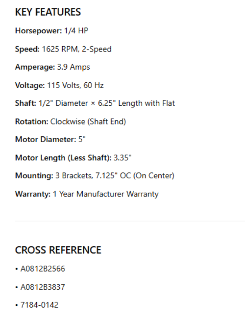 615058A, OEM Replacement, 1/4Hp, 1625 RPM, 115V, CWSE, 5" Dia.