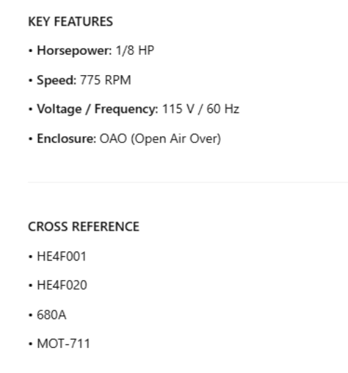 680P, OEM Replacement, 1/8Hp, 775 Rpm, 115V, 60 Hz, OAO