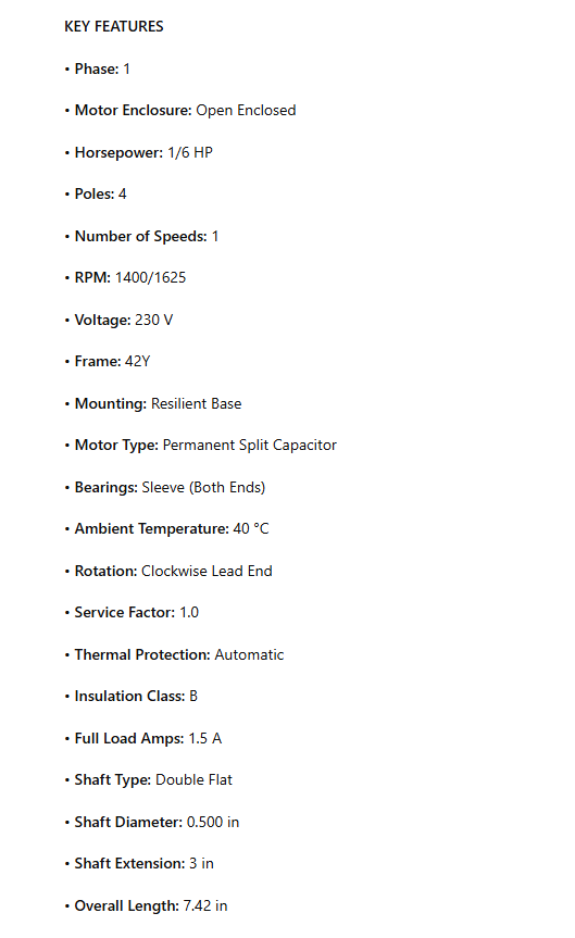 OCP0251, OEM Replacement Motor, 1/6Hp, 1400/1625 RPM, 230V, 1PH, 50/60Hz, Fr. 42