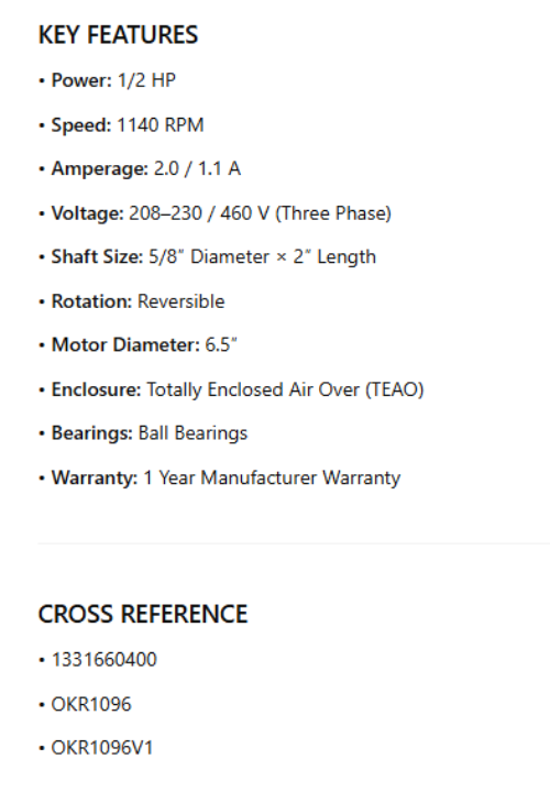 OKR1096N, OEM Replacement, 1/2Hp, 1140 RPM, 208-230V/460V, TEAO is backordered and will ship as soon as it is back in stock.