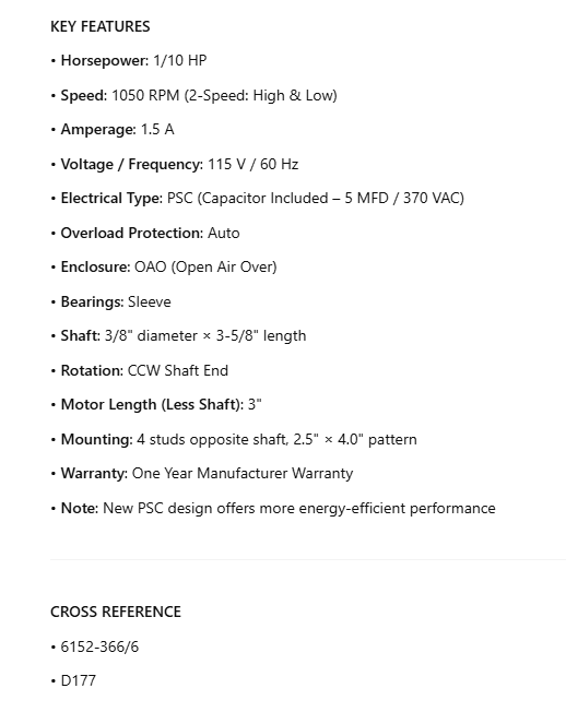 PVQT-400, OEM Replacement, 1/10Hp, 1050 Rpm, 115 V, CCWSE, 60 Hz, OAO is backordered and will ship as soon as it is back in stock.