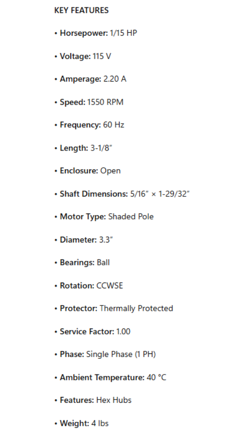 SS355, 1/15Hp, 1550RPM, 115V, 1Ph, 60Hz, CCWSE, 3.3” Dia.