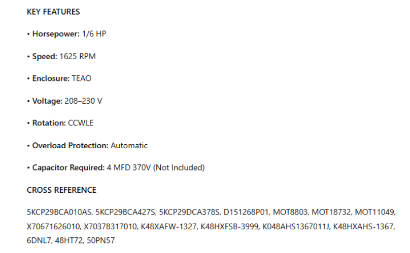 • Capacitor Required: 4 MFD 370V (Not Included)