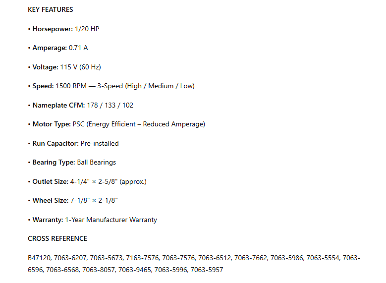 • Motor Type: PSC (Energy Efficient – Reduced Amperage)