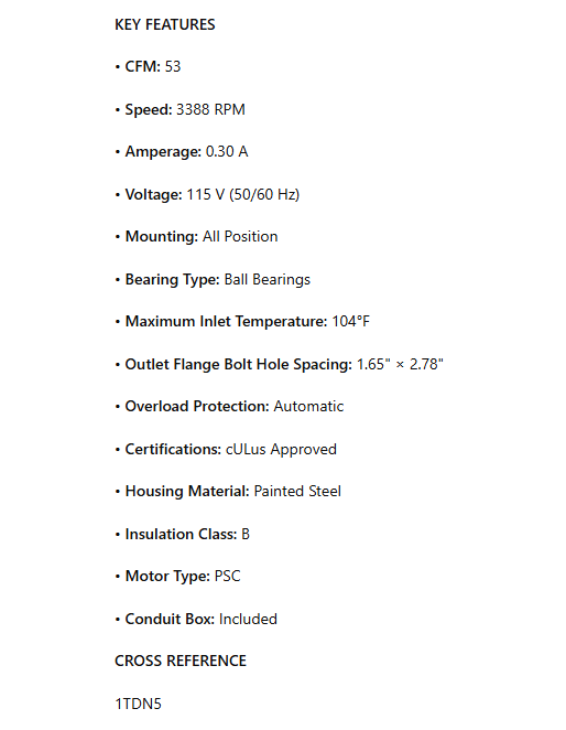 PTDN5, Centrifugal Blower, 53 CFM , 3388 RPM, 115V