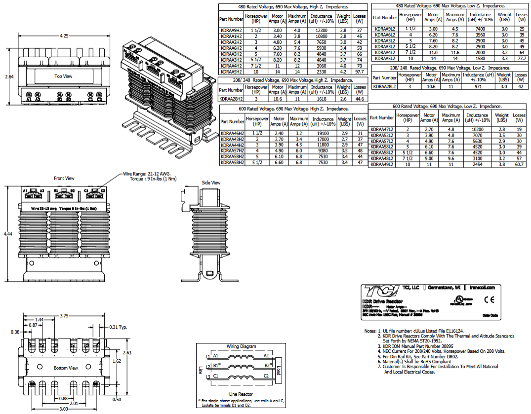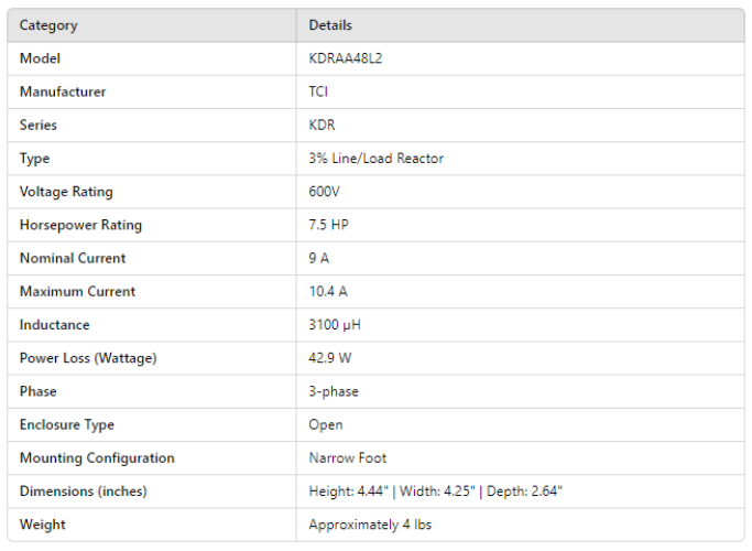 KDRAA48L2, 3% LINE/LOAD REACTOR 600V 7.5Hp 9A NOMINAL 10.4A MAX 42.9W 3100uH INDUCTANCE (C1)