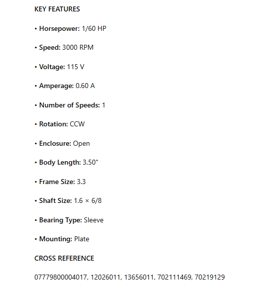 HB-RBM120, Exhaust Blower, 1/60Hp, 3000 RPM, 115V, 1Ph, 60Hz, Frame 3.3''