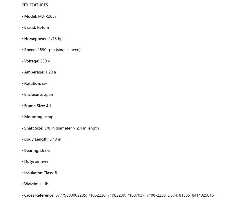 M3-R2657, Rotom, 1/15Hp, 1550 Rpm, 230 Volts, DP, Frame: 4.1",7108-2230,