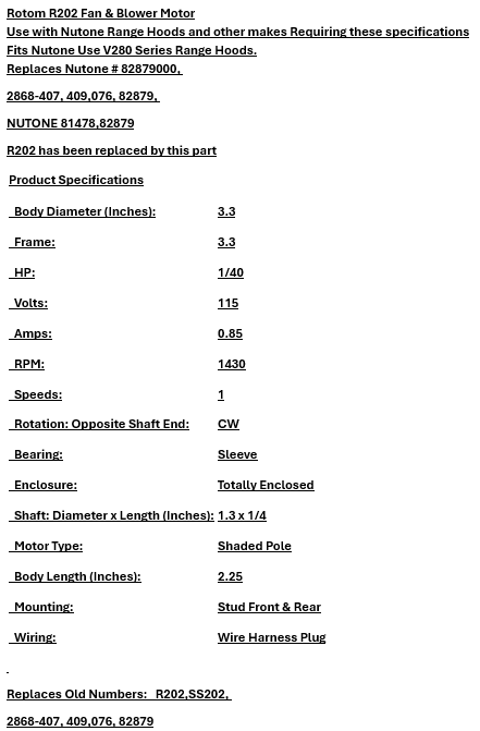 R202-06, 06-R202, SS202, MOTOR 1/40HP,2868-FAN & BLOWER 3.3" TOTALLY ENCLOSED 1430 RPM 115V NUTONE 81478,82879