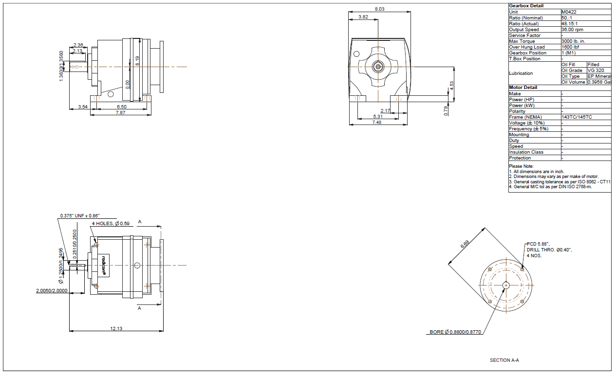 M042250.BANR, Gearbox 1.5Hp, 575V, Ratio 50.1:1, Input Frame: 143/145TC, 1.250