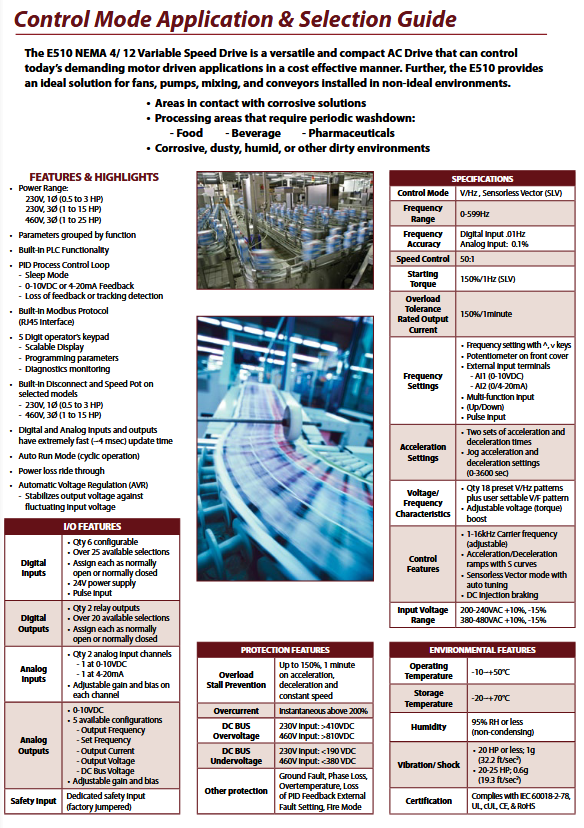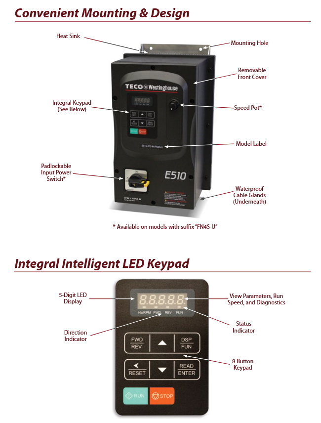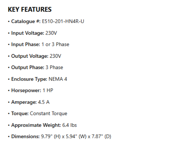 E510-201-HN4R-U, MEDIUM DUTY AC DRIVE, 1Hp, 230V, NEMA 4, 50/60Hz,
