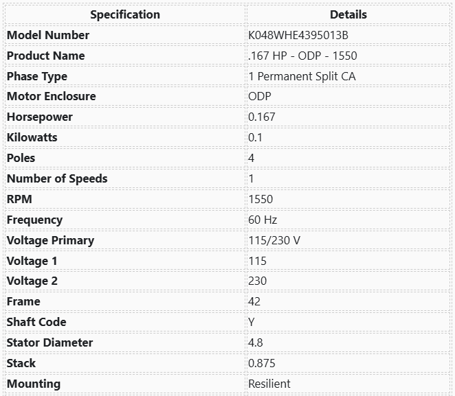 722P, Nidec, 1/6Hp, 1550 Rpm, 208-230 Volts, Frame:42Y, Enclosure:ODP,