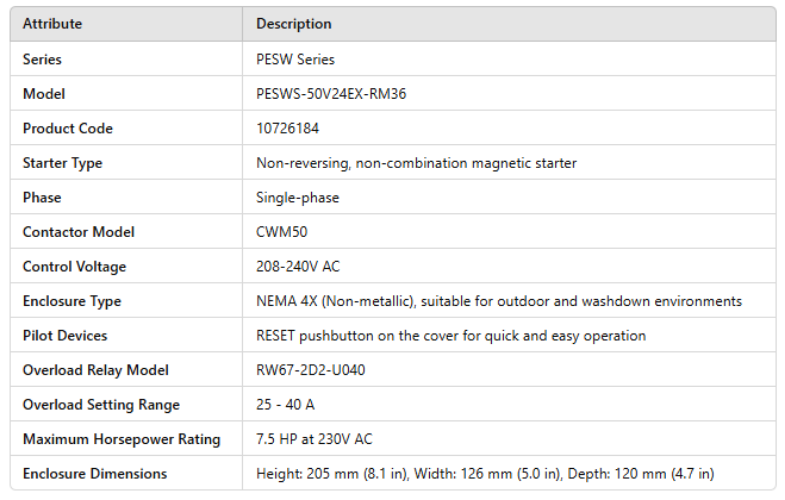 PESWS-50V24EX-RM38, 7.5Hp, 208-240V, 32 - 50 A, Coil with Start-Reset Pushbuttons - Single Phase, 10075663 is backordered and will ship as soon as it is back in stock.