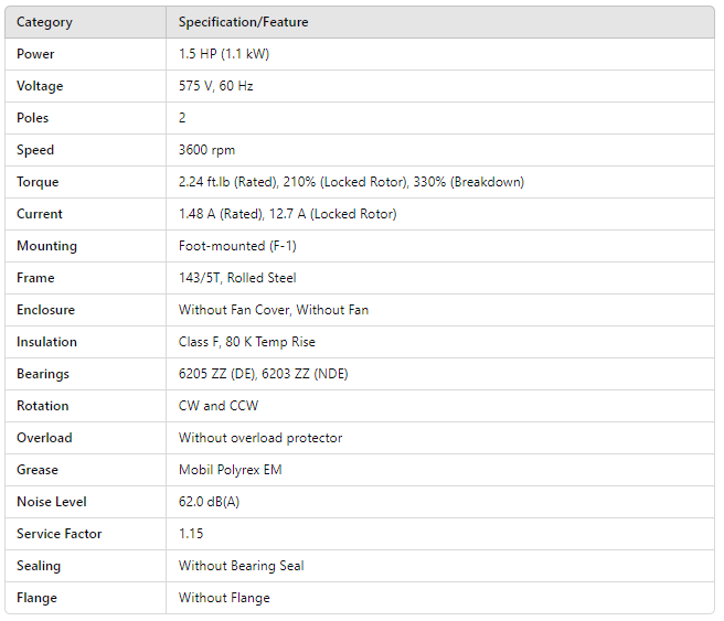 DP001502NPW01, Rolled Steel NEMA Premium Efficiency 1.5Hp 3510 Rpm 2P 143/5T 3Ph 575 V 60 Hz IC01 - ODP - Foot-mounted