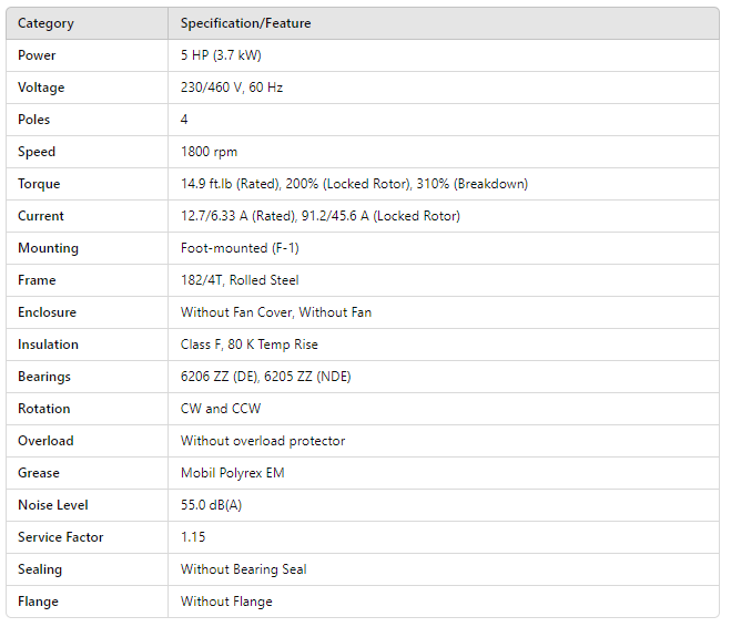 DP005404NPW01, Rolled Steel NEMA Premium Efficiency 5Hp 1760 Rpm 4P 182/4T 3Ph 230/460//190-220/380-415 V 60 Hz IC01 - ODP - Foot-mounted