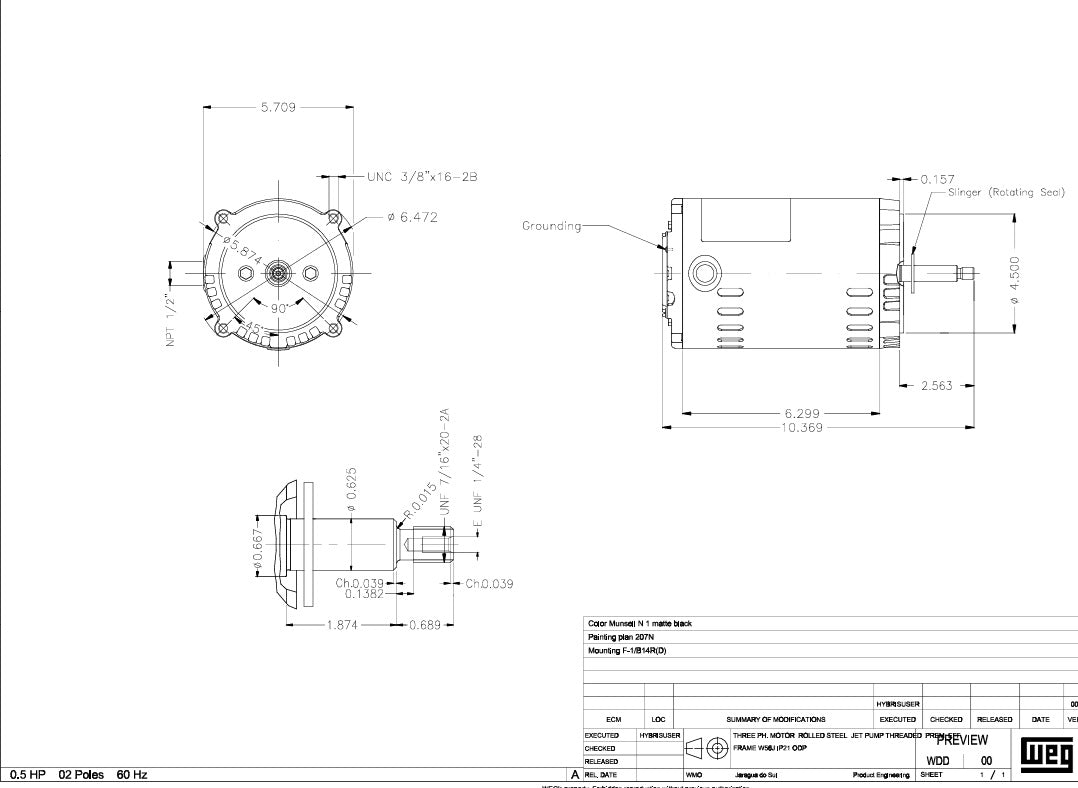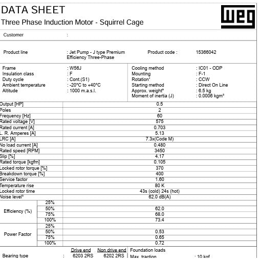 JO.50502W01DOE, Weg, 1/2Hp, 3480 Rpm,575V,Fr:A56J,10611650, ODP, Pump,