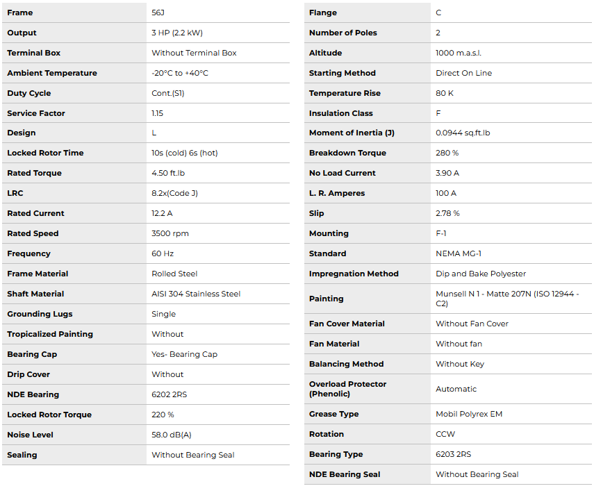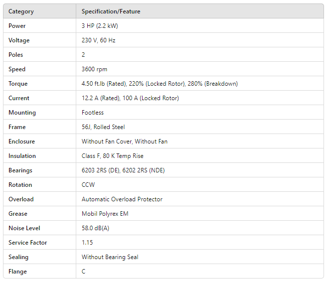 Torque 4.50 ft.lb (Rated), 220% (Locked Rotor), 280% (Breakdown)