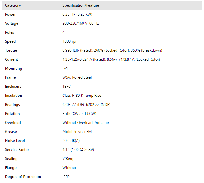 TF.33404W01DOE, Rolled Steel Premium Efficiency 0.33Hp 1740 Rpm 4P W56 3Ph 208-230/460//190-220/380-415 V 60 Hz IC411 - TEFC - Foot-mounted is backordered and will ship as soon as it is back in stock.