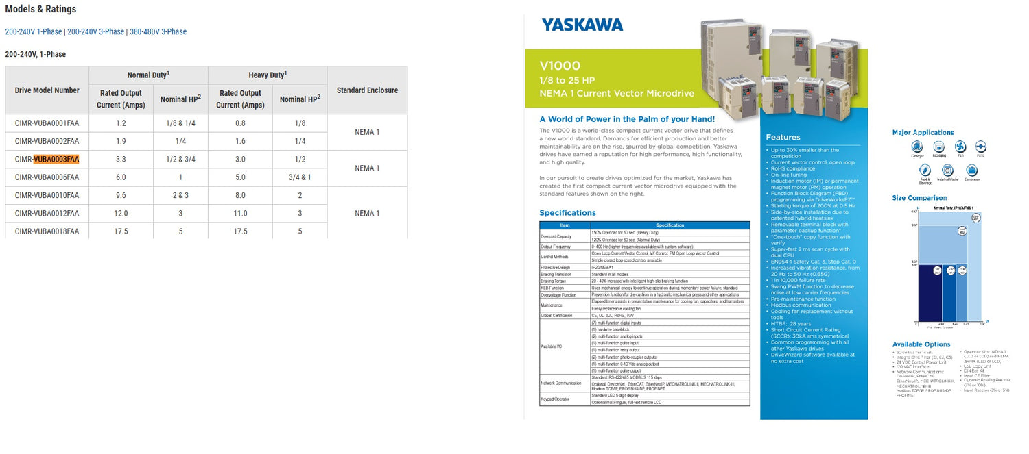 VUBA0003FAA, Yaskawa, VFD Drives, 1/2Hp, 240V,Nema 1, 3.0A Output,