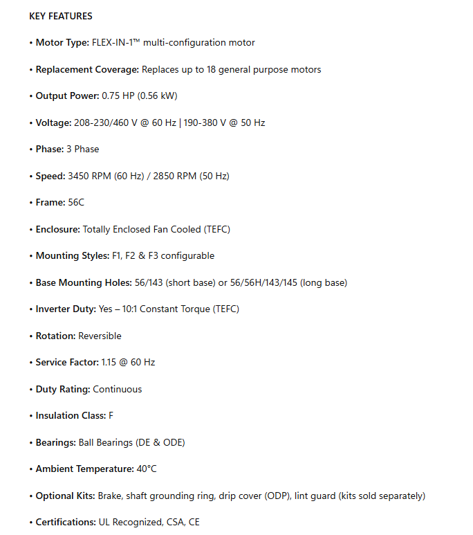 Replacement Coverage: Replaces up to 18 general purpose motors