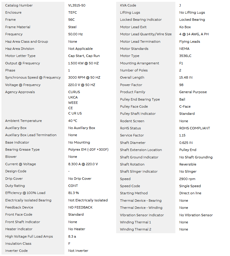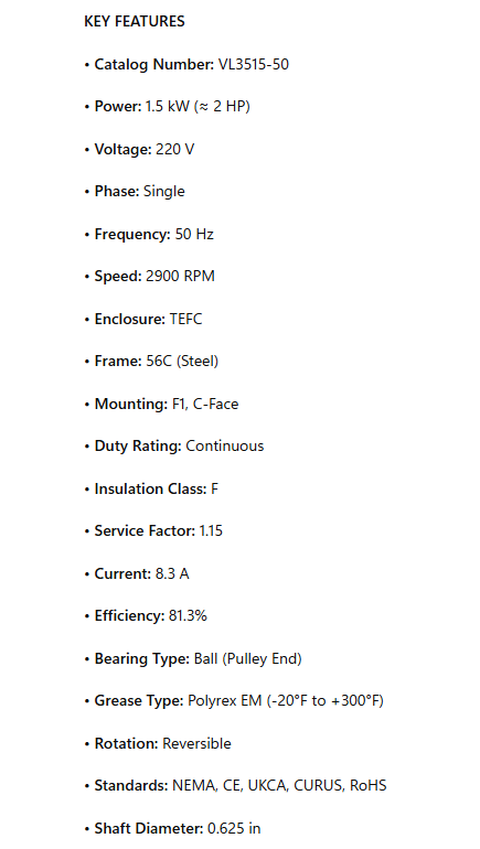 VL3515-50, 2Hp(1.5Kw), 2900RPM, 220V, 1Ph, 50Hz, 56C, 35E022G772, TEFC