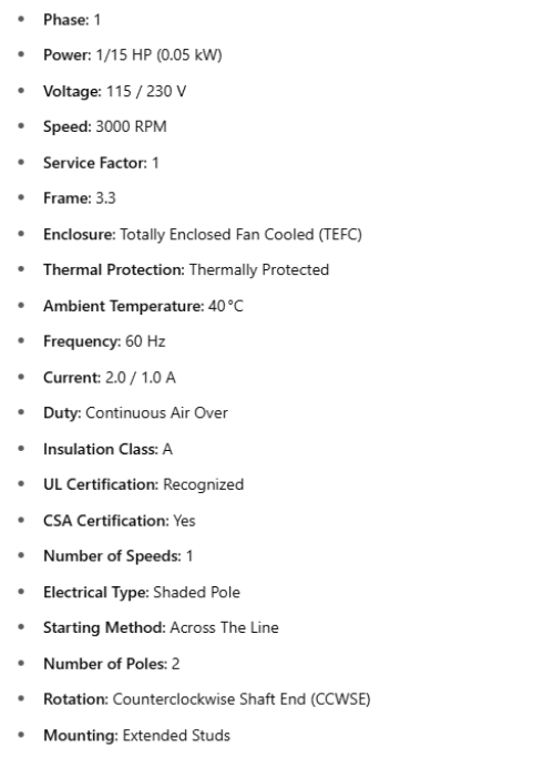 JB1R050N, Magnetek, 1/15Hp, 3000 Rpm, 115-230V, Frame:3.3, Tefc,
