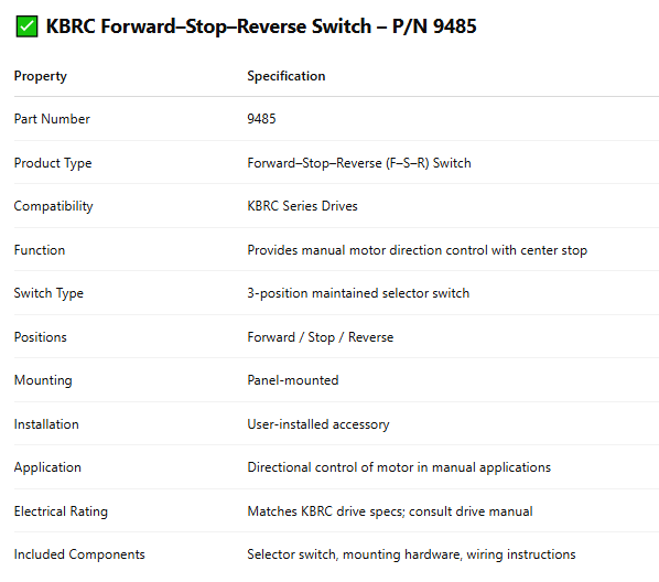 9485, KBRC, Forward - Stop - Reverse switch est en rupture de stock et sera expédié dès qu’il sera de retour en stock.