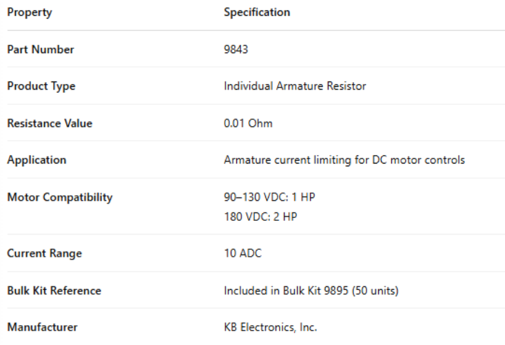 9843, INDIVIDUAL RESISTOR .01 Ohm ARMATURE 1Hp 90-130VDC ~ 2Hp 180VDC 10ADC (BULK KIT 50x 9895) est en rupture de stock et sera expédié dès qu’il sera de retour en stock.