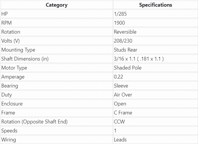 T1-R617, Rotom, 1/285Hp, 1900 Rpm, 208-230 Volts, Open enclosure,