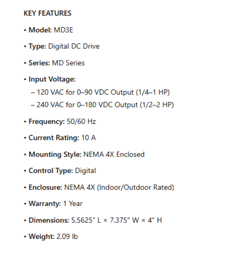 MD3E, Drive Dc 10a 1/4-1Hp 120vac 0-90vdc 1/2-2Hp 240vac 0-180vdc 50/60hz Nema 4x Enclosed