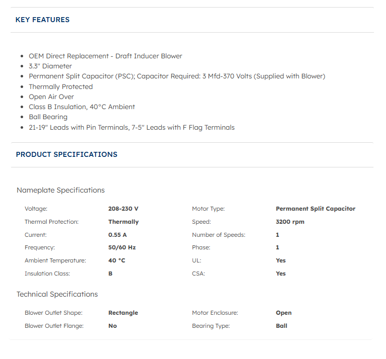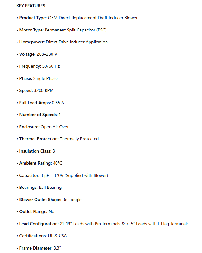 Product Type: OEM Direct Replacement Draft Inducer Blower