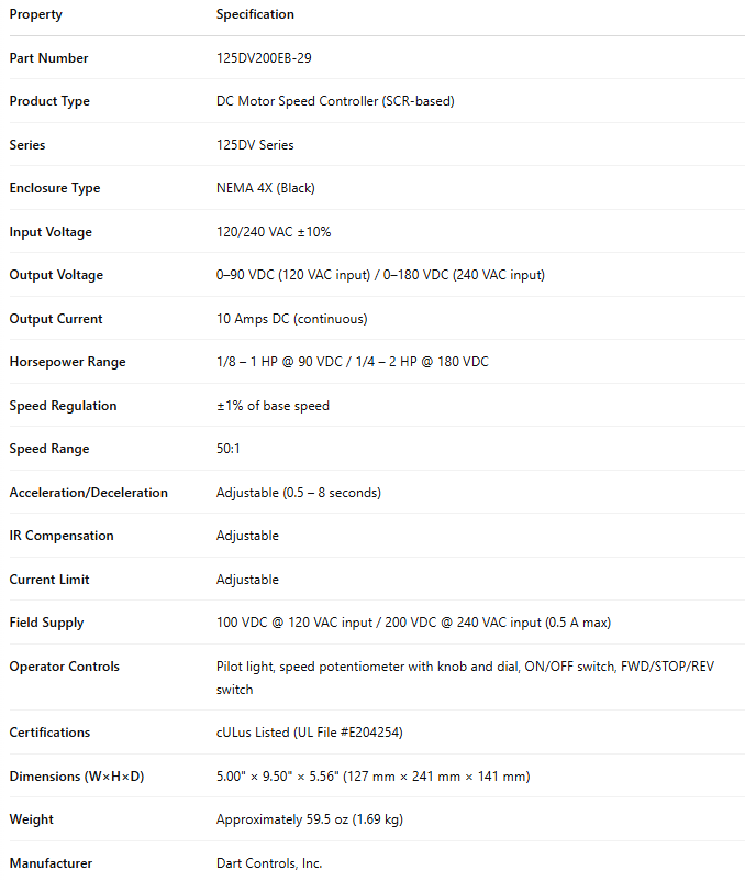 125DV200EB-29, 1/8-2Hp 120/240V(i/p) 90/180VDC (o/p) FWD/OFF/REV NEMA 4X Black