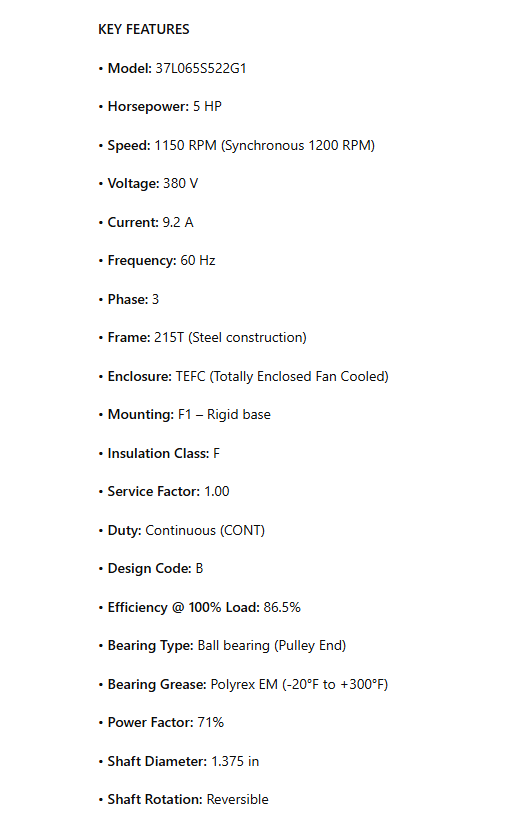 37L065S522G1, 5Hp, 1150 RPM, 380V, 3Ph, 60Hz, Frame 215T, TEFC, F1,
