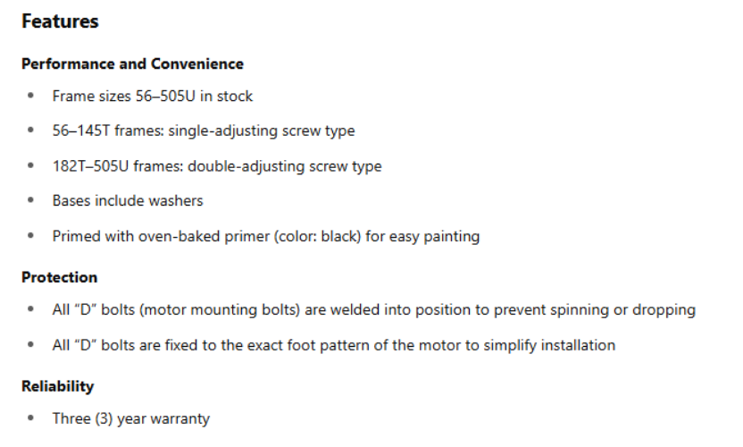 • All “D” bolts are fixed to the exact foot pattern of the motor to simplify installation