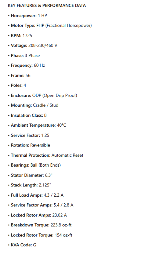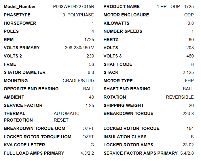 8498, 1Hp, 1725 Rpm, 208-230/460V, ODP, Frame 56 , 6.3" Dia. , P063WBD4227015B