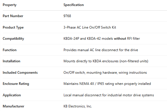 Our stock of KB Electronic accessories features a range of control periphery products from switch kits and fuse kits to replacement potentiometers and AC line filters. These products provide more functions and better performance to your KB Electronics AC and DC drives.
