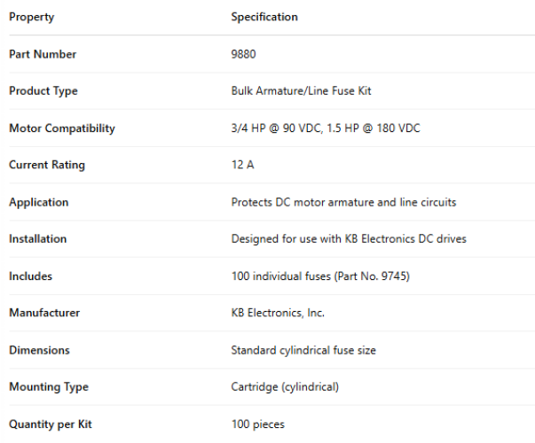 9880, BULK FUSE KIT (100PCS) 3/4HP 90VDC ~ 1.5HP 180VDC 12A (UNIT P/N 9745) est en rupture de stock et sera expédié dès qu’il sera de retour en stock.