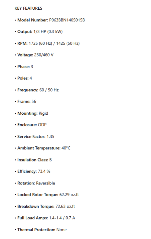 Output: 1/3 HP (0.3 kW)