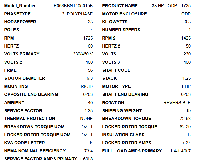 D13P2AH, 1/3Hp, 1725 RPM, 208-230/460V, 3PH, 60Hz, ODP, Fr. 56H, P063BBN1405015B