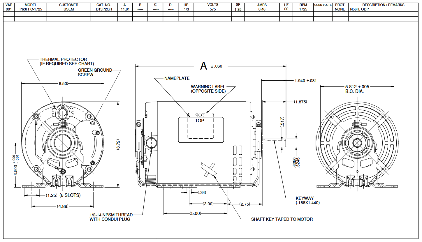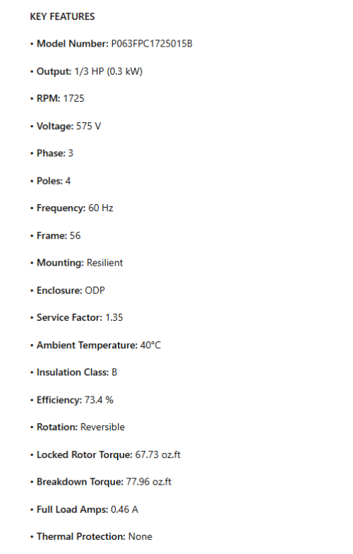 D13P2GH, 1/3Hp, 1725 RPM, 575V, 3PH, 60Hz, ODP, Fr. 56H, P063FPC1725015B