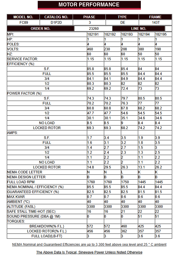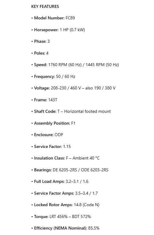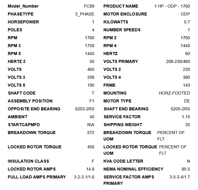 D1P2D, 1Hp, 1760 RPM, 208-230/460V, 3PH, 60-50Hz, ODP, Frame 143T, FC89