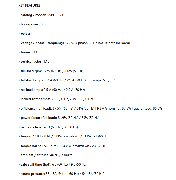 • torque (50 hz): 9.9 lb-ft FL / 334% breakdown / 231% LRT