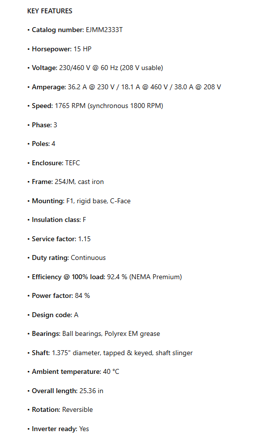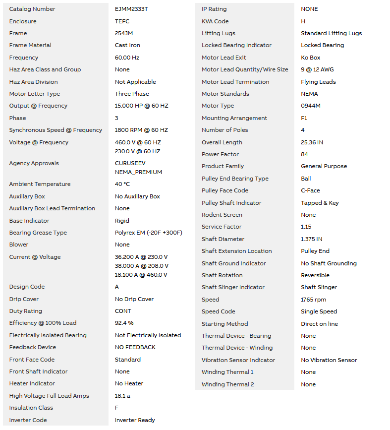 EJMM2333T, 15Hp, 1765 RPM , 230/460V, 3PH ,60HZ, 254JM, 0944M, TEFC, F1