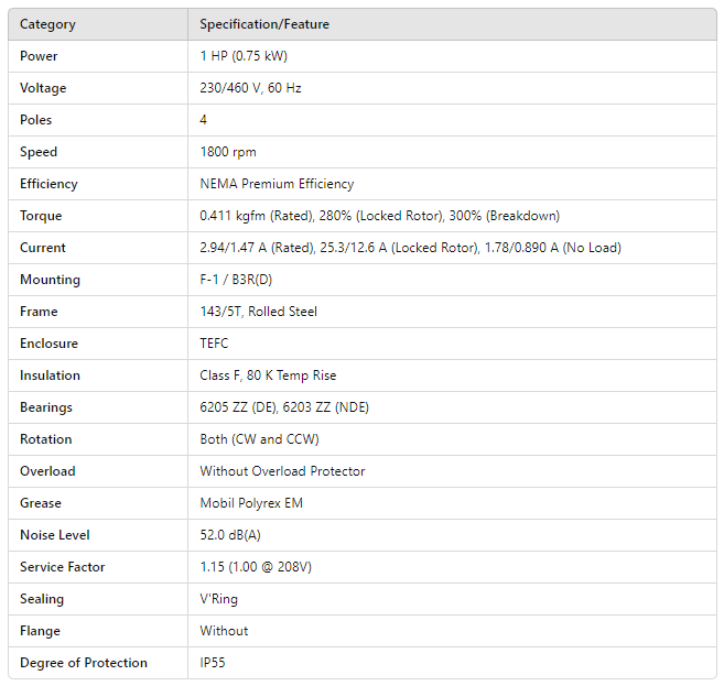 HT000404NPW01, ELECTRIC MOTOR THREE PHASE ROTOR SQUIRREL CAGE 1Hp 1765 Rpm 4P 143/5T 208-230/460//190-220/380-415 WCF2 60Hz F-1/B3R(D) IP55 NEMA PREMIUM EFFICIENCY ROLL