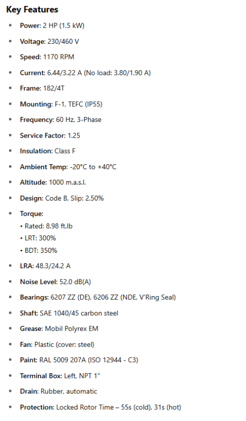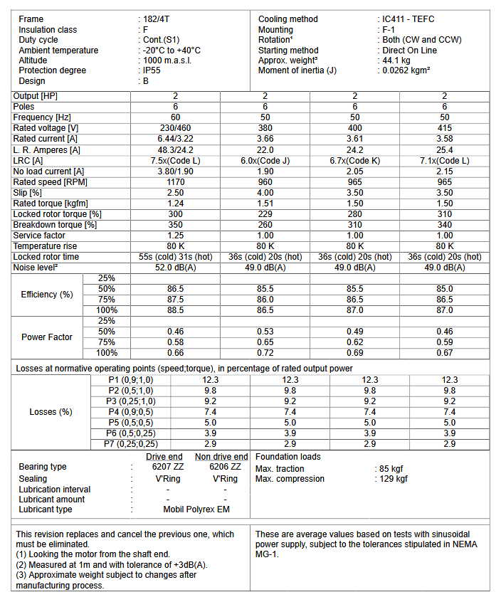 • Bearings: 6207 ZZ (DE), 6206 ZZ (NDE, V'Ring Seal)