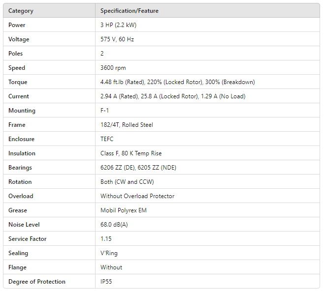 Torque 4.48 ft.lb (Rated), 220% (Locked Rotor), 300% (Breakdown)