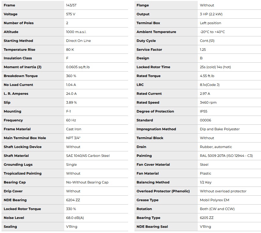 HT003502NPW22145T, W22 NEMA Premium Efficiency 3Hp 3460 RPM 2P 143/5T 3Ph 575 V 60 Hz IC411 - TEFC - Foot-mounted