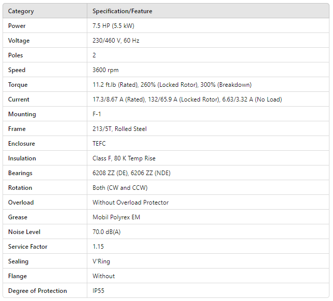 HT007402NPW01, Rolled Steel NEMA Premium Efficiency 7.5Hp 3530 Rpm 2P 213/5T 3Ph 230/460//190-220/380-415 V 60 Hz IC411 - TEFC - Foot-mounted