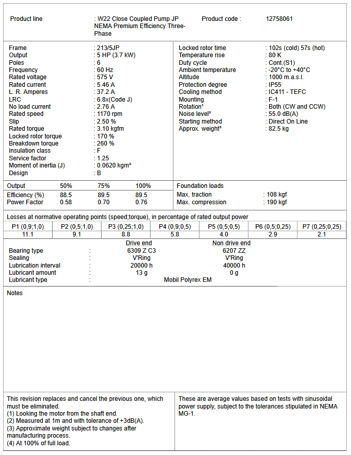JP005506NPW22, W22 Close Coupled Pump JP NEMA Premium Efficiency 5Hp 1170 RPM 6P 213/5JP 3Ph 575 V 60 Hz IC411 - TEFC - Foot-mounted