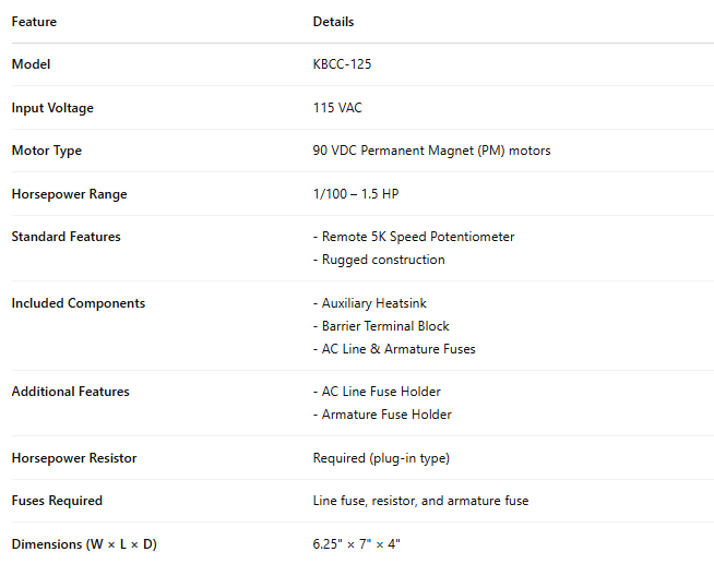KBCC-125, SCR DC Drive 1.5Hp 16A 115VAC 1PH Input 90VDC Output Non-Reversing Chassis